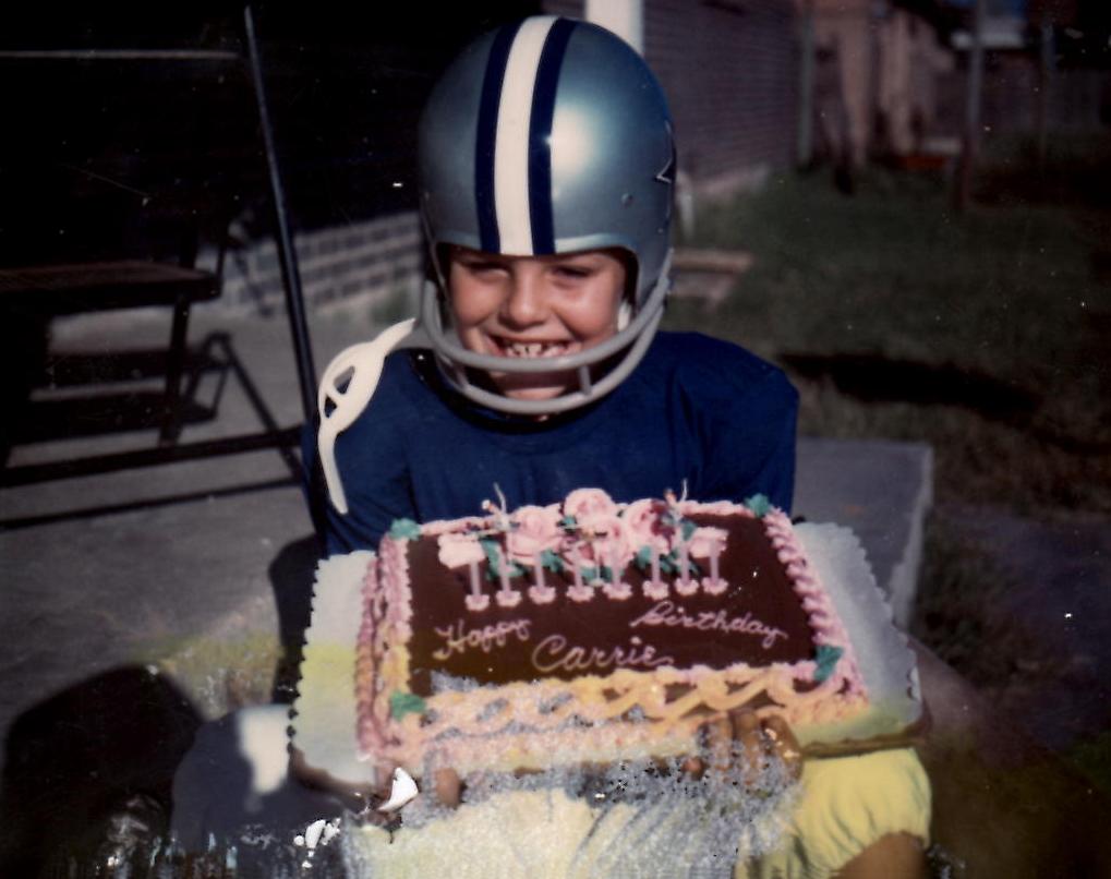 Obviously my parents didn’t care, as long as I was happy. And as you can see by the photo below, I seemed pretty darned pleased. I pointed out to my mother that while I was wearing a Dallas Cowboys football uniform, somehow she managed to make my cake with ROSES on it. LOL! Poor woman – she tried. And I won’t even go into the years of fighting over dresses vs. jeans.